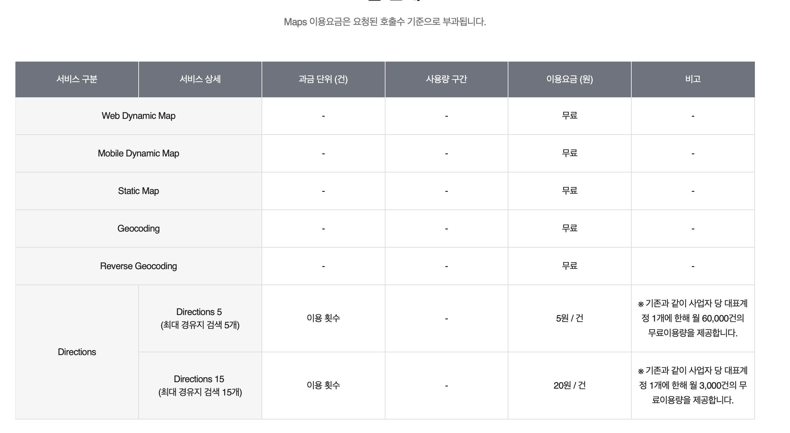 저희는 iOS앱에 Map을 적용시켜볼 것이니 사용할 상품은 Mobile Dynamic Map이고 이는 무료라고 나와있어요 같은 경우는 사용한도가 없고요. 밑에 건당 요금이 부과되는 상품은 경유지를 이용해서 길을 찾는 경우인 것 같네요.