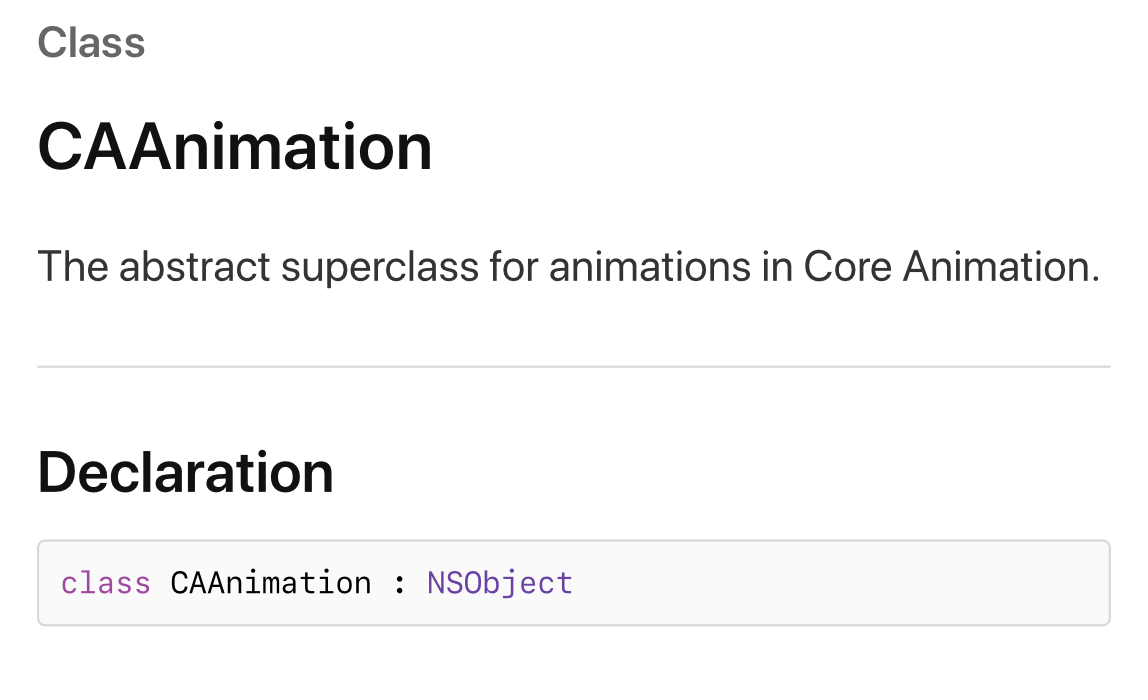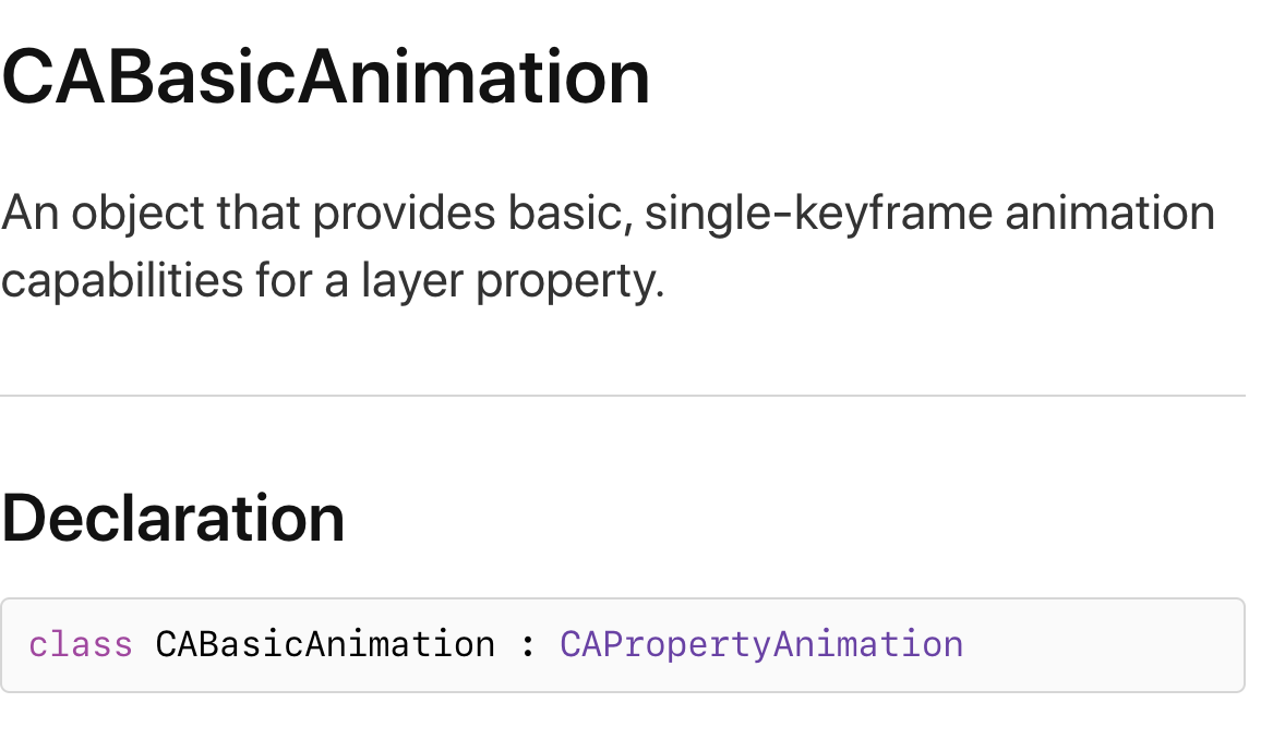 즉, NSObject > CAAnimation > CAPropertyAnimation > CABasicAnimation, CAKeyFrameAnimation 단계로 추상화됩니다.
