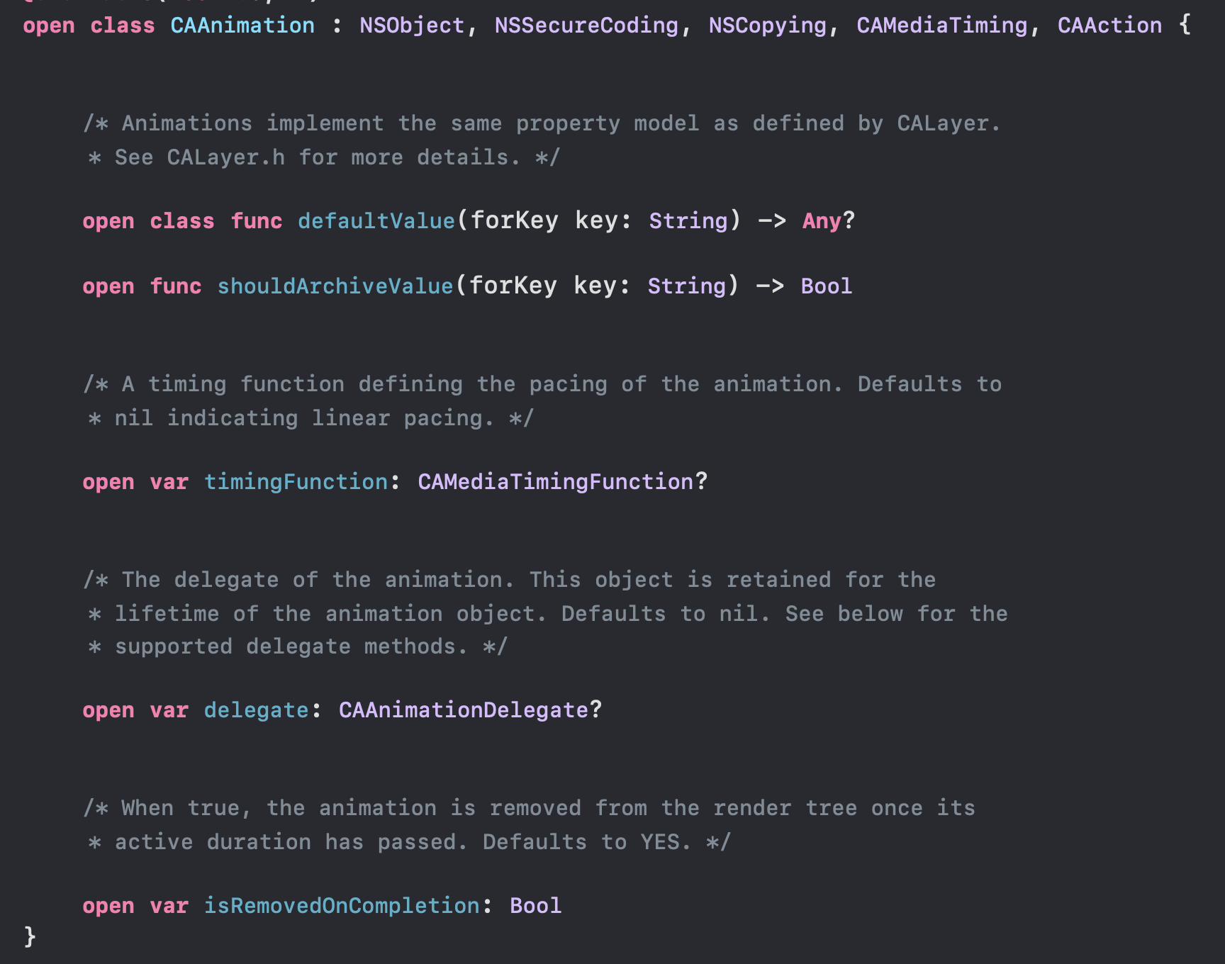 이건 위에서 설명하지 않은 property들인데요! isRemovedOnCompletion과 timingFunction은 모두 CAAnimation의 property이고, duration과 fillMode는 CAMediaTiming 프로토콜 내의 property입니다. 이를 CAAnimation이 채택하고 있습니다.