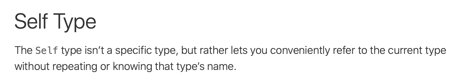Self 타입은 특정한 Type이 아니고! 타입의 이름을 반복해서 쓰는 대신에 현재 타입을 쓸 수 있도록 도와준다!!라고 쓰여져 있는데 즉, 클래스, 구조체, enum 등에서 Self를 사용하면 그 타입을 가리킨다는 뜻으로 이해할 수 있네요.