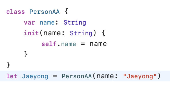 PersonAA라는 타입을 가진 클래스를 만들고 Jaeyong이라는 PersonAA 타입의 인스턴스를 만들어준거예요!