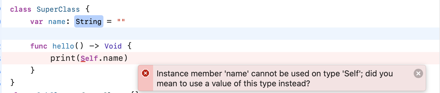 대문자로 시작하는 Self 타입은 말 그대로 SuperClass와 SubClass 타입을 가리키고 있고, 소문자 self 프로퍼티는 SuperClass와 SubClass의 인스턴스들을 가리키고 있는 것입니다!!