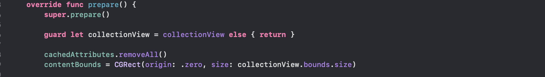 prepare 메소드에서 각 cell의 attribute을 계산해줍니다. 그리고 다시 계산하지 않도록 자료구조(캐시)에 저장합니다. 또한 content size도 함께 계산해줍니다. layout을 커스텀하는데 꼭 필요한 메소드는 아니지만 미리 계산해주어 성능을 높이는데 사용할 수 있습니다.