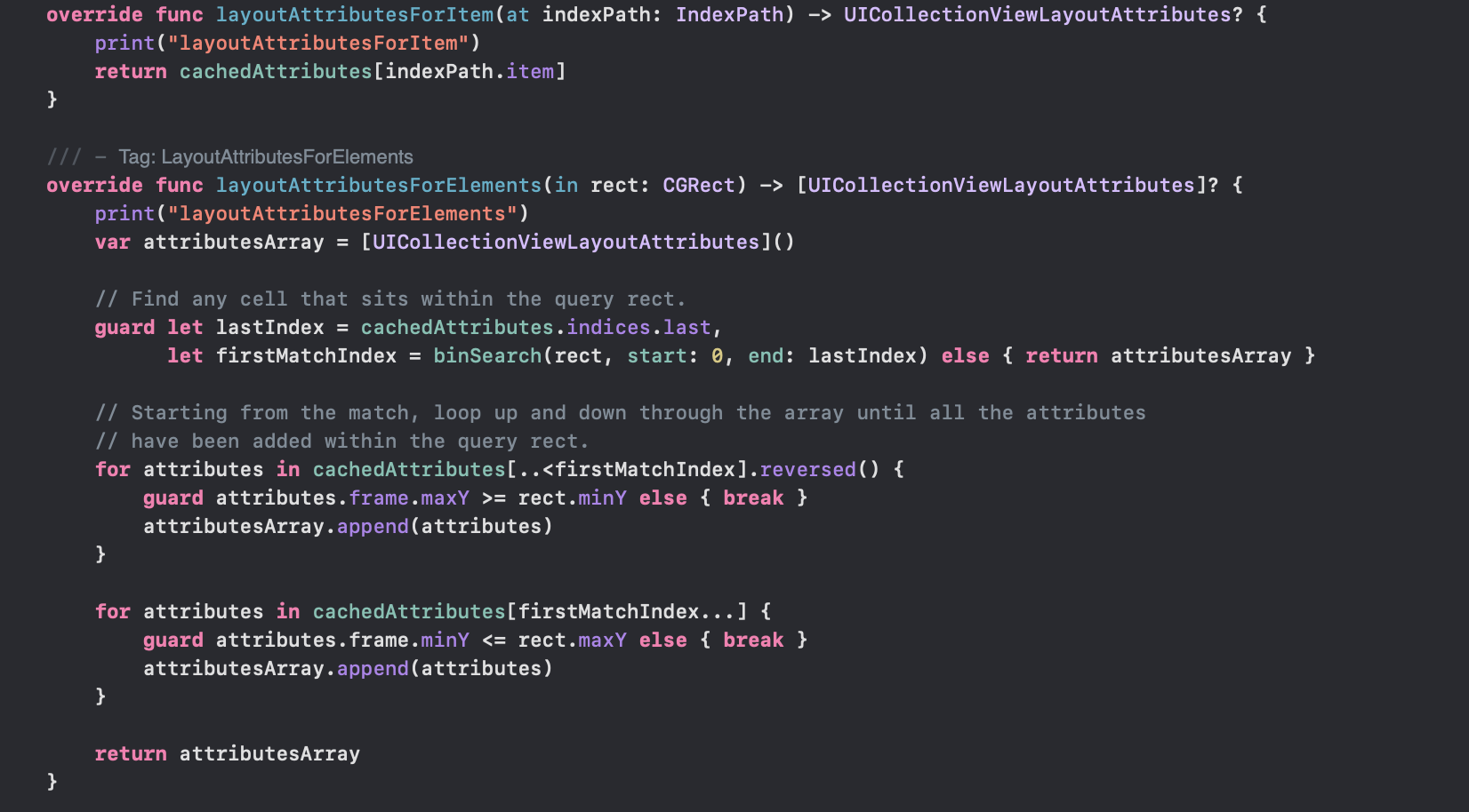 open func layoutAttributesForElements(in rect: CGRect) -> [UICollectionViewLayoutAttributes]?
